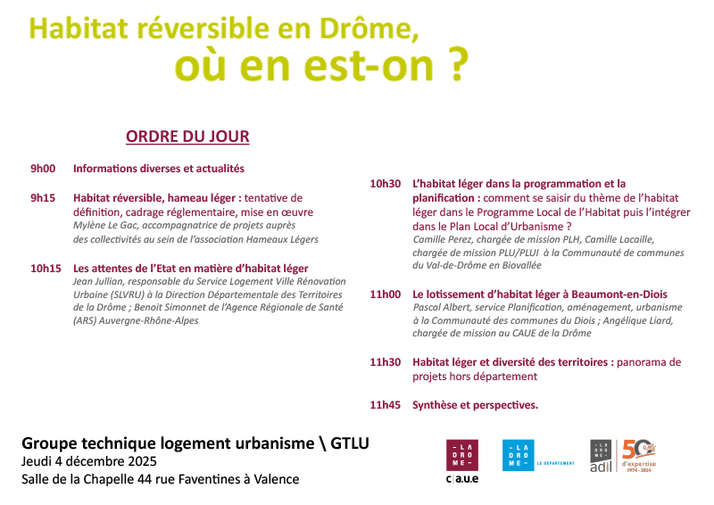 Une quarantaine de techniciens des collectivités drômoises se sont retrouvées le 4 décembre 2025 pour un GTLU portant sur l’habitat réversible, organisé par le CAUE et l’ADIL observatoire de l’habitat, sous l’égide du Département de la Drôme.